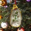 The edge of the shell is hand-painted in gold ink, and the inside of the shell has a special pearl coating that shimmers through the image. The oyster shell has a satin ribbon to hang as an ornament, or it can be removed to display on a shelf/sideboard.