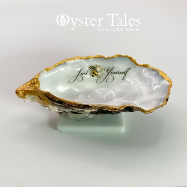 The flat top shell forms a delicate lid, finished with a faux pearl knob that adds an elegant touch and makes it easy to lift. Inside, a charming and uplifting message is revealed: “Just 🐝 Yourself” — with a tiny bee embellishment thoughtfully placed to stand in for the word “bee.” It’s a subtle, playful detail that makes this piece both meaningful and memorable.