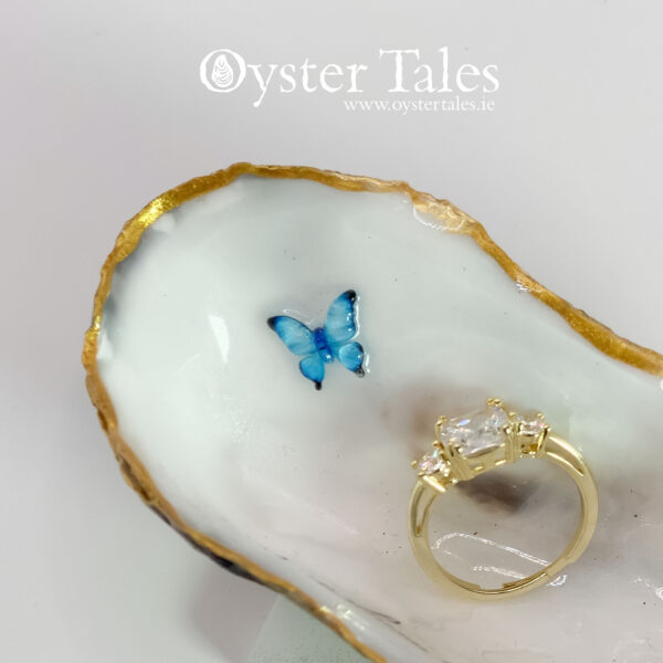 These are wild, natural oyster shells gathered from the west coast of Ireland, and each one varies in size, shape, and natural markings. The average shell measures approximately 2″ × 3″, though some may be slightly shorter or taller, wider or narrower. As each piece is individually decorated by hand, the artwork will also vary, making every trinket dish truly unique. Any embellishments on the shell may change in design from time to time.