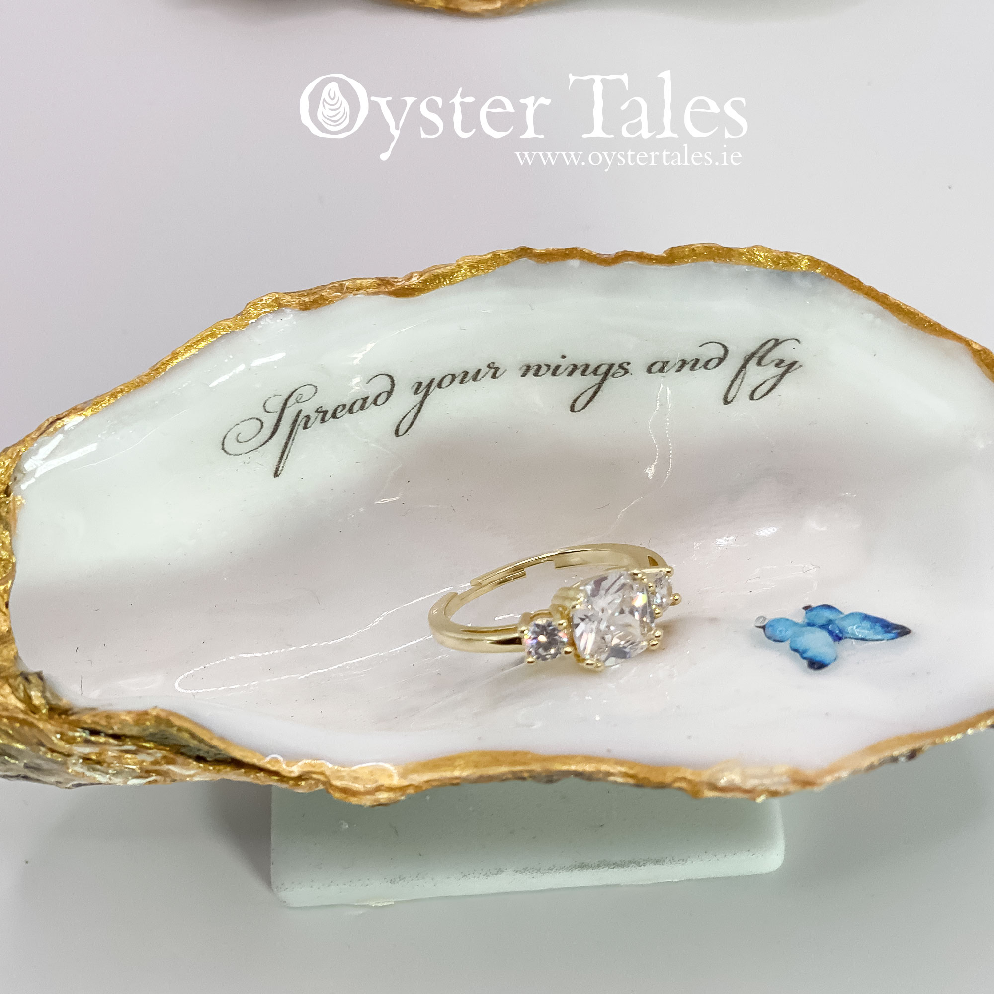 The flat top shell forms an elegant lid, finished with a faux pearl knob that adds a refined touch and makes it easy to lift. Inside, an inspiring message is revealed: “Spread your wings and fly”, accompanied by a delicate butterfly embellishment—symbolising growth, transformation, and new beginnings.